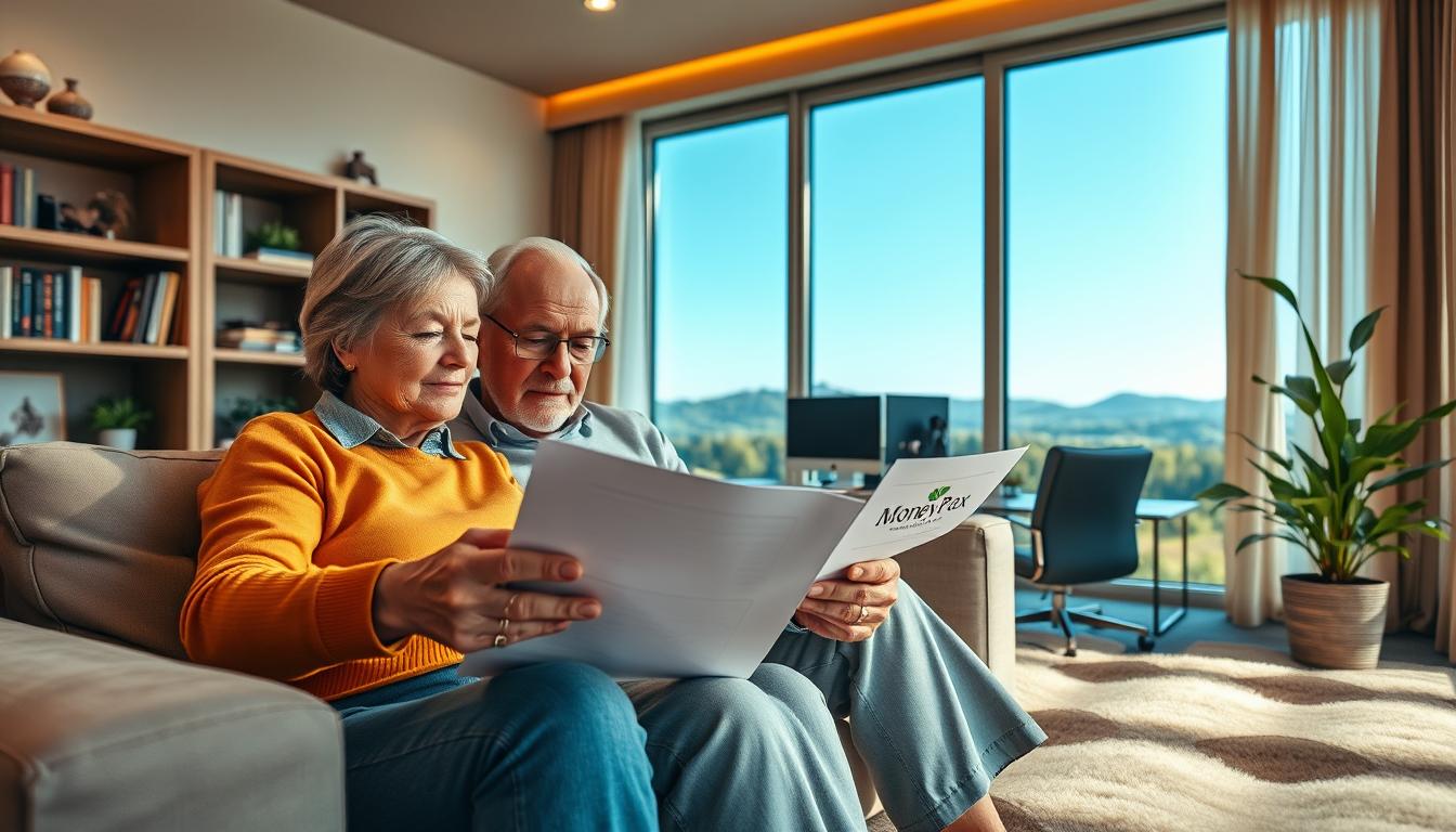 A tranquil retirement planning scene with a focus on post-retirement income strategies. In the foreground, a retiree sitting at a desk surrounded by financial documents and a laptop displaying the MoneyPax logo. In the middle ground, shelves filled with books and binders on personal finance and investment. The background depicts a warm, sun-dappled home office with large windows overlooking a peaceful garden. Soft, natural lighting bathes the scene, creating a serene, contemplative atmosphere. The composition conveys a sense of thoughtful preparation and prudent financial management for a comfortable retirement.